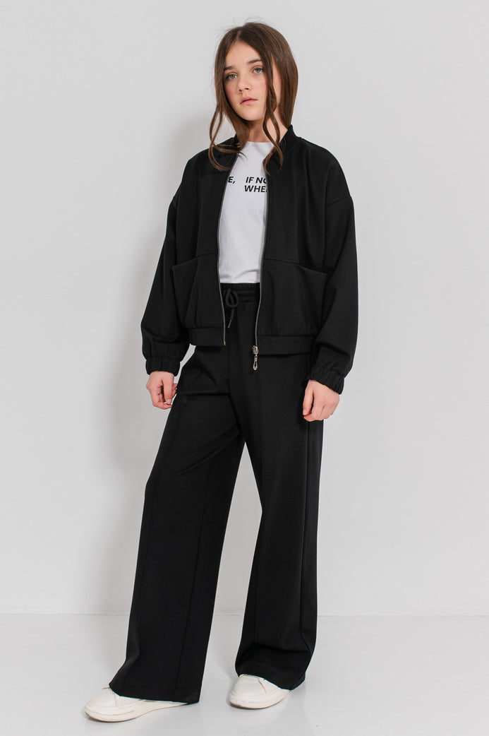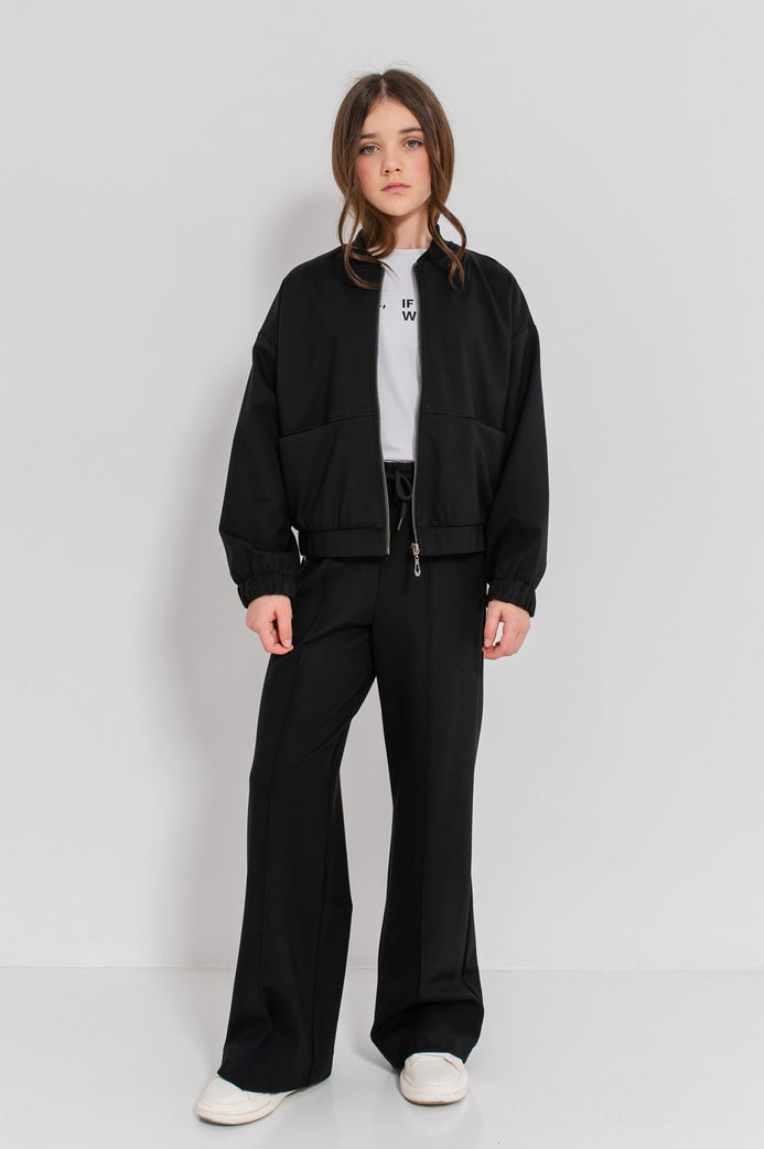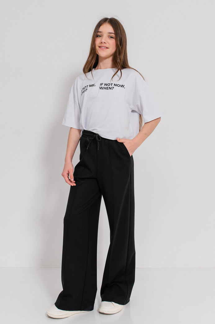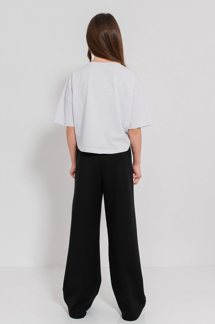Pantaloni realizati din jersey gros premium, moale si usor elastic pentru confort sporit. Sunt alegerea ideala pentru o tinuta scolara moderna si eleganta. Talia inalta cu banda elastica, croiala evazata si dunga centrala confera o silueta alungita si o tinuta impecabila. Se potrivesc cu camasi, bluze elegante, bluze casual sau tricouri. Pot fi completati de sacou, vesta, trenci, jacheta sau geaca.