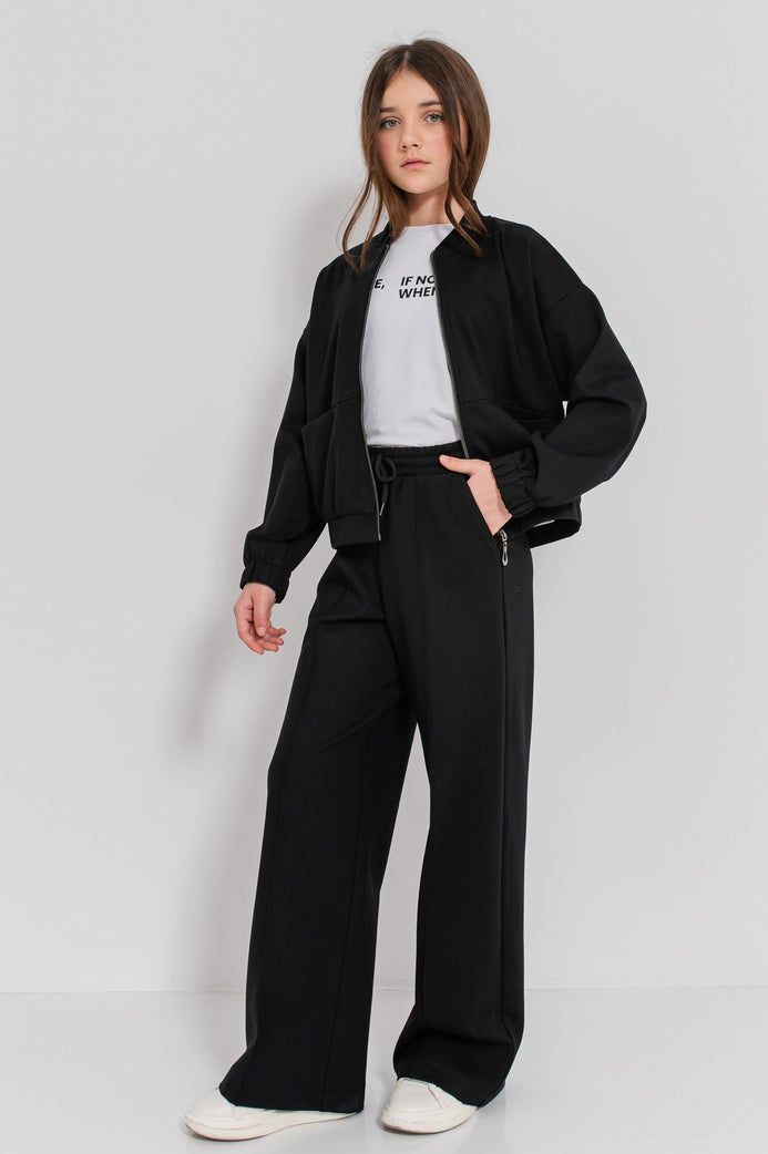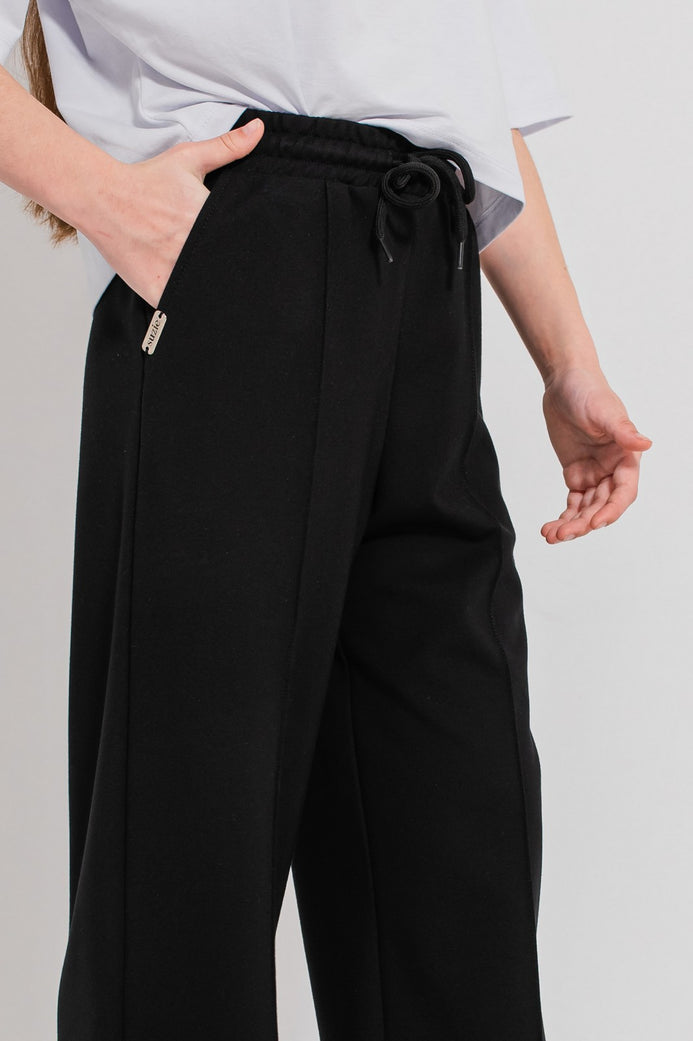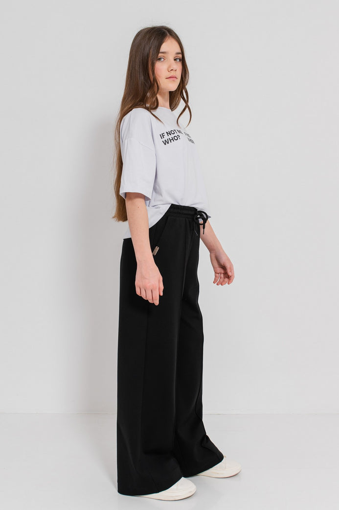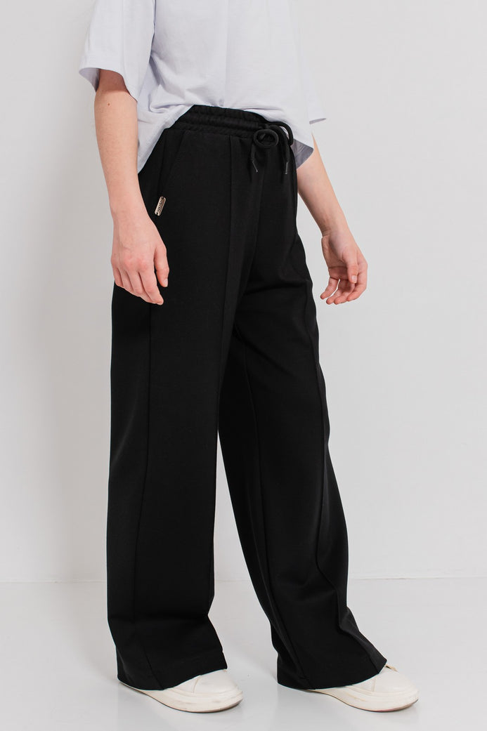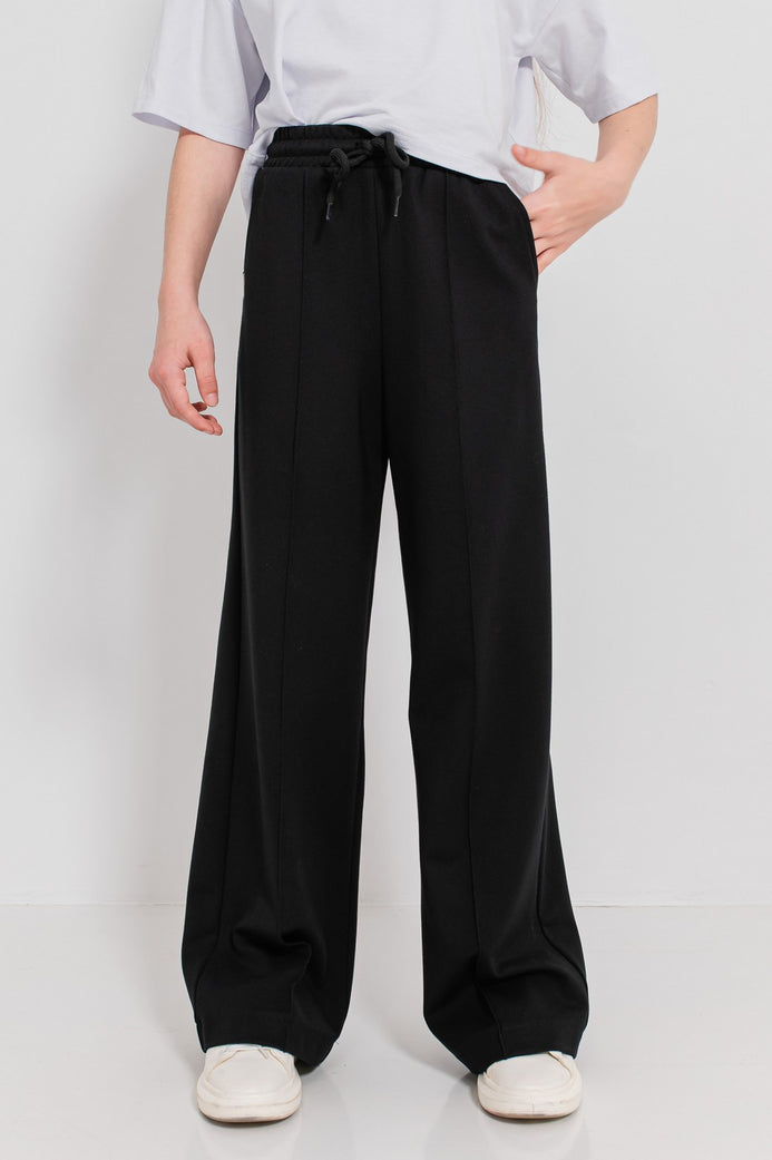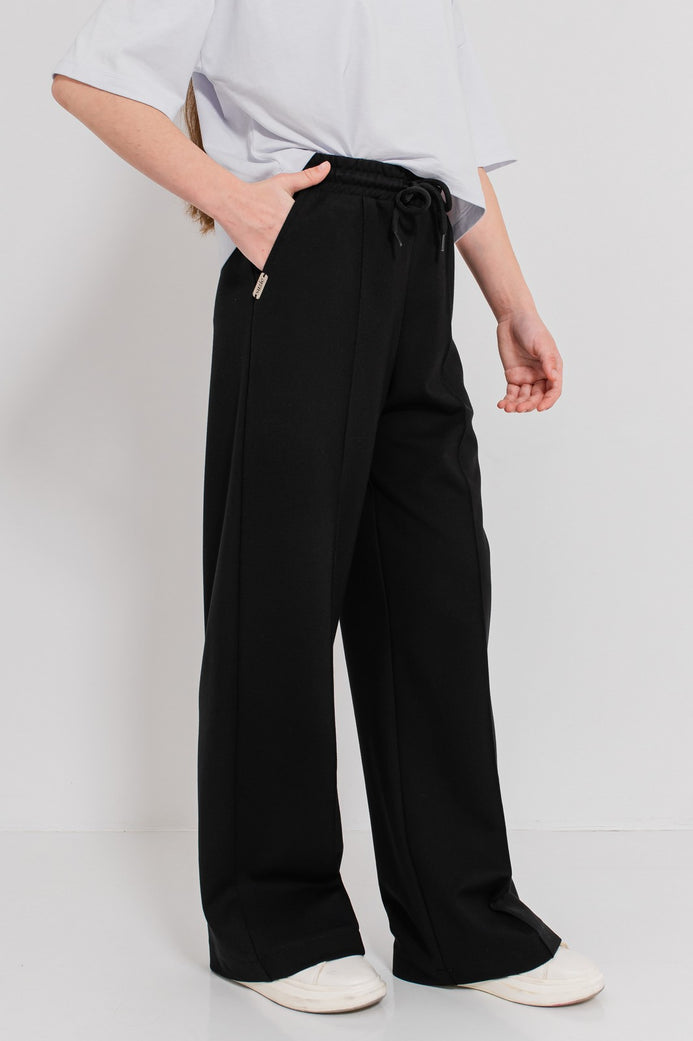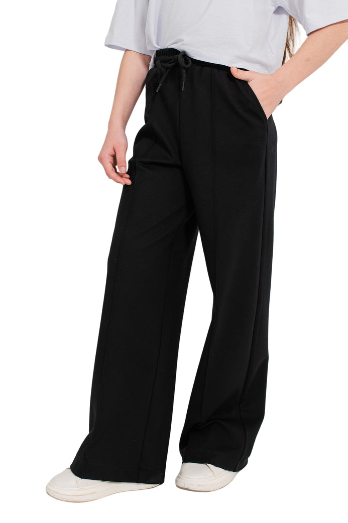 Pantaloni lungi cu croiala evazata, talie inalta elastica, buzunare laterale si dunga pentru tinute de scoala cu stil.