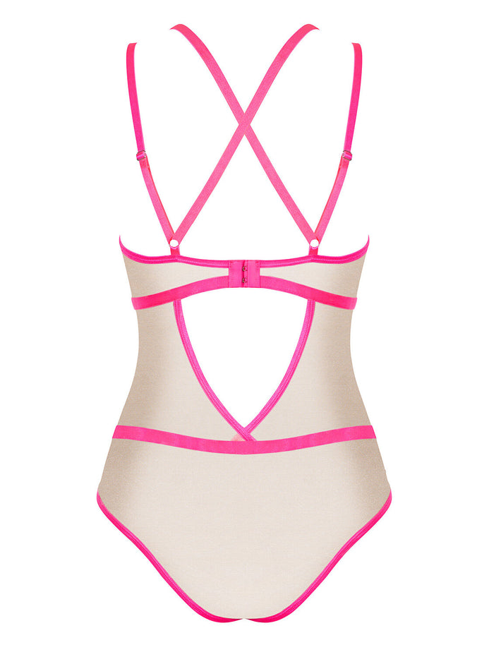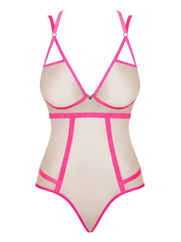 Dezvăluie‐ți latura couture cu o piesă de colecție care îmbină transparența şic a tulle-ului nude cu detalii statement în roz neon și fire subtile aurii. Croiala tip teddy urmărește linia corpului, iar decupajele triunghiulare deasupra bustului și pe șolduri adaugă un efect „wow” instant. Bretelele multiple se întâlnesc la spate într-un joc elegant de benzi elastice, permiţând ajustare și o susţinere impecabilă a bustului. Materialul premium este fin ca mătasea, dar suficient de elastic pentru a sculpta formele şi a oferi confort îndelungat. Ideal pentru cadouri intime sau pentru momente în care doreşti să te simţi irezistibilă.