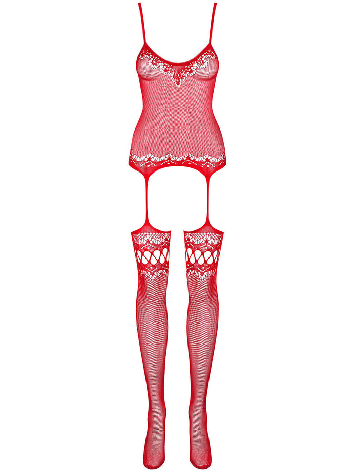 Bodystocking Obsessive F214 - lenjerie erotică din plasă cu portjartier și decupaje S-L (one size), roșu