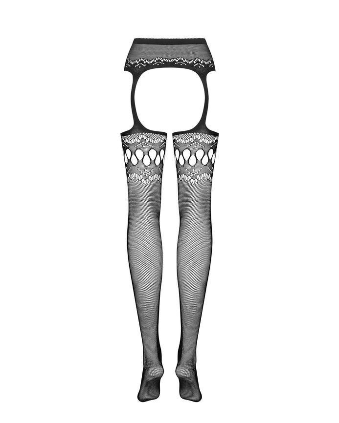 Dres Feisty Garter Stockings S214 din plasa fina cu model sexy, portjartier si decupaje - marime universala (one size), negru