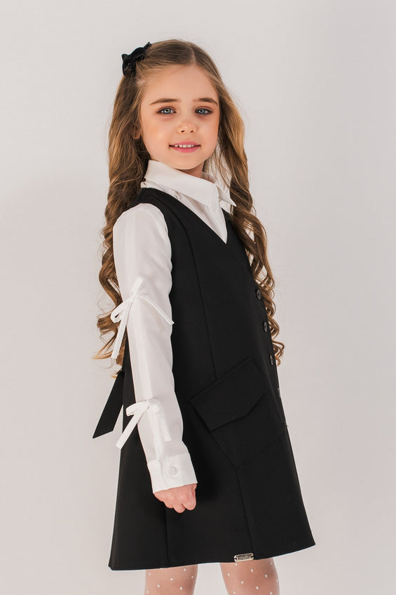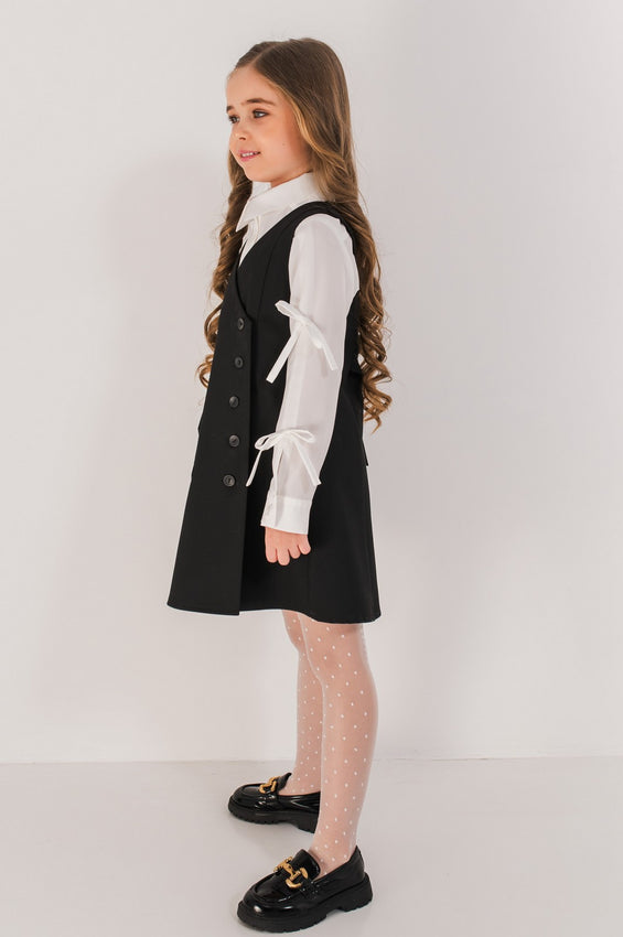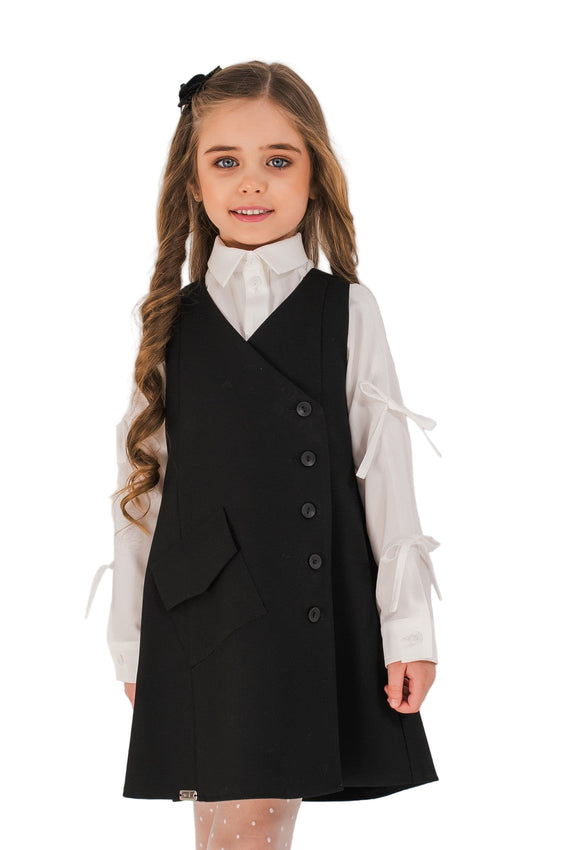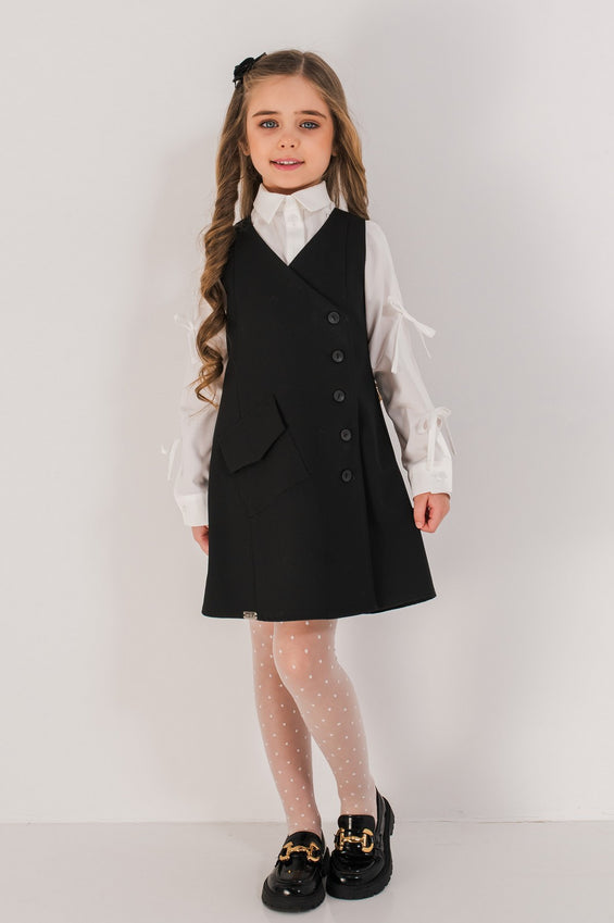 Sarafan cu model petrecut din stofa eleganta cu nasturi decorativi, cordon reglabil in talie si captuseala fina pentru confort in tinutele de scoala.