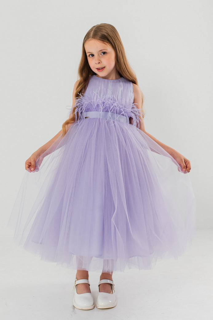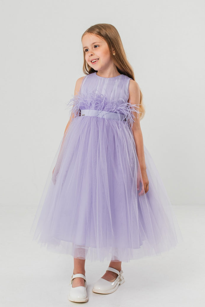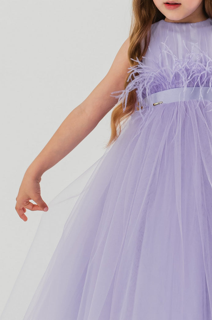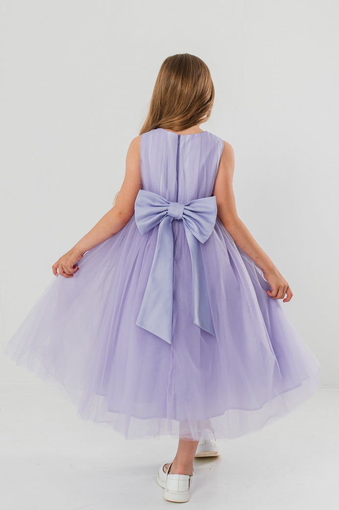 JASMINE – Rochita de ocazie din tulle fin cu saten si drapaje cu funda decorativa, lavanda