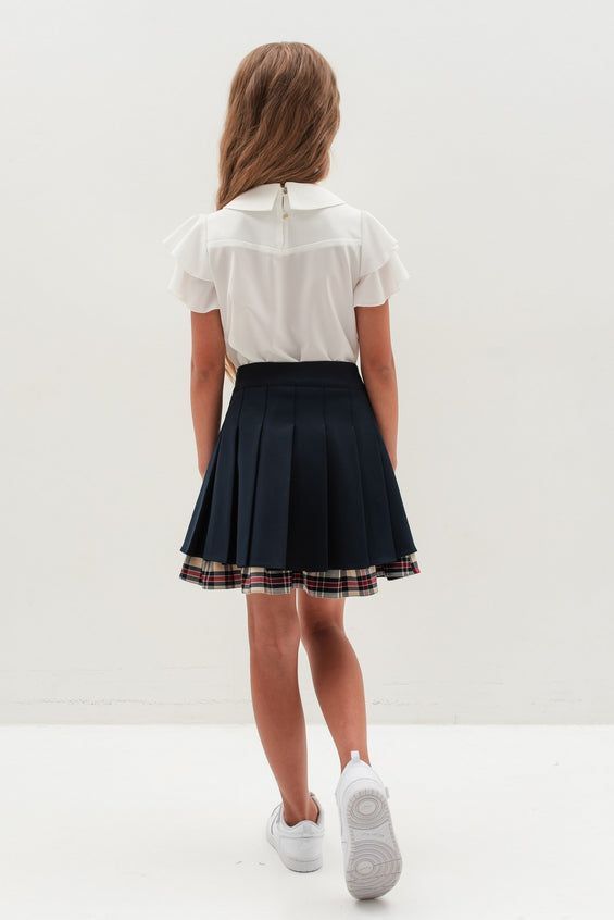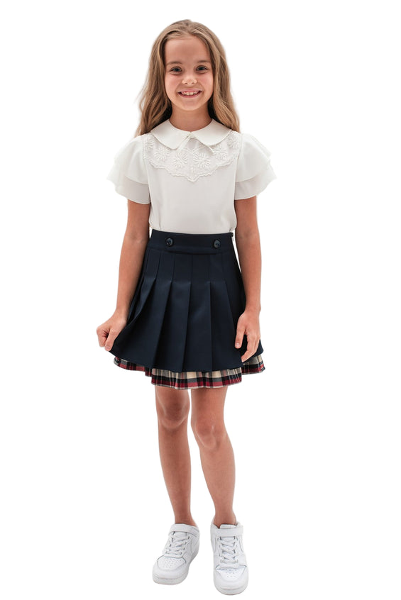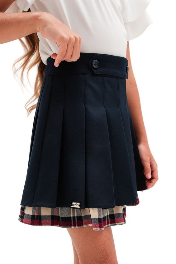Fusta scurta eleganta cu pliuri din stofa bleumarin si insertii in carouri pentru un look inedit; un model care nu trebuie sa lipseasca din garderoba fetitelor, fiind alegerea perfecta pentru scoala.