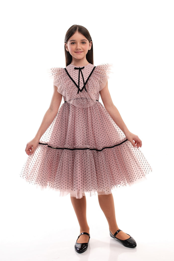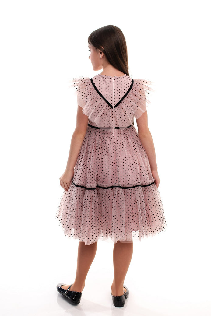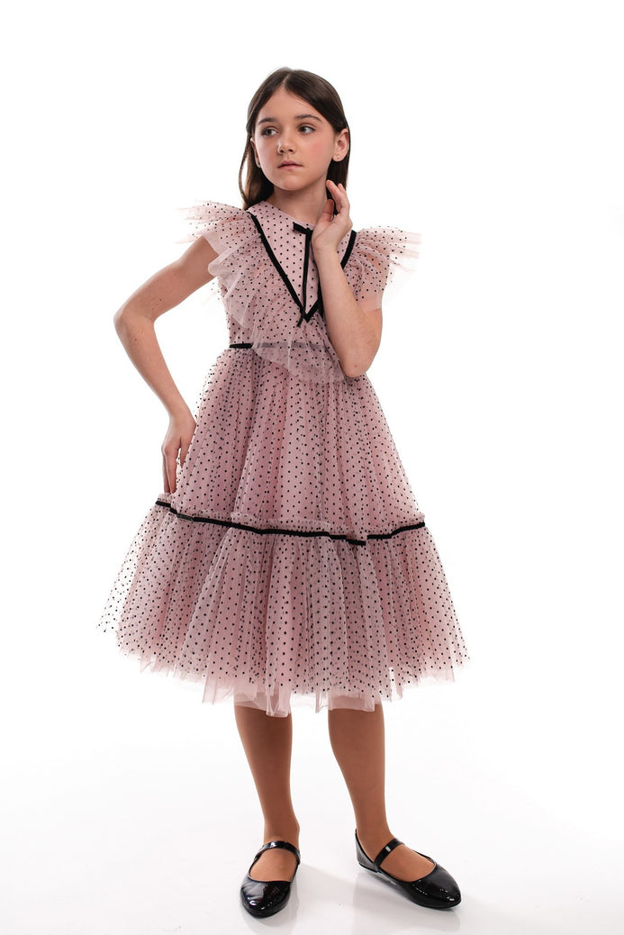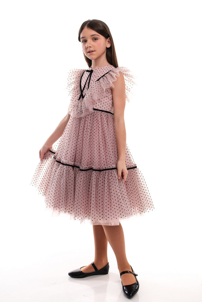 ODALYS – Rochie eleganta din tulle fin cu volane, buline si panglici din catifea, roz prafuit