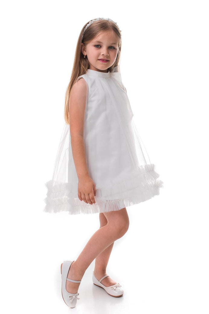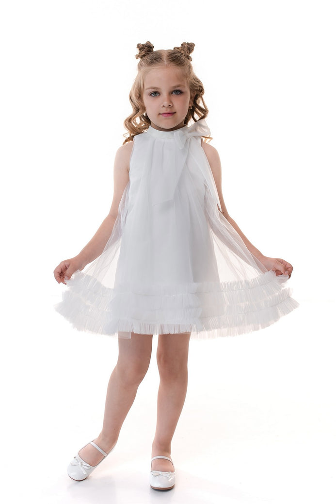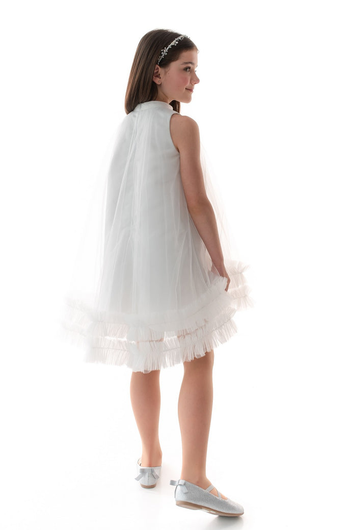 Voal delicat, tulle extra-fin, croială lejeră și accente couture – o rochie elegantă în stil minimalist! Rochia PORTIA este alegerea perfectă pentru domnișoarele care iubesc eleganța simplă și rafinamentul. Are un design fluid, guler delicat cu fundă decorativă și detalii din tulle plisat la bază. Voalul dublu stratificat pe exterior ii ofera aspect diafan și textură ușor vaporoasă. Volanele din tulle plisat la baza fustei, aplicate în două rânduri pentru un finisaj deosebit, îi oferă un aspect inedit.