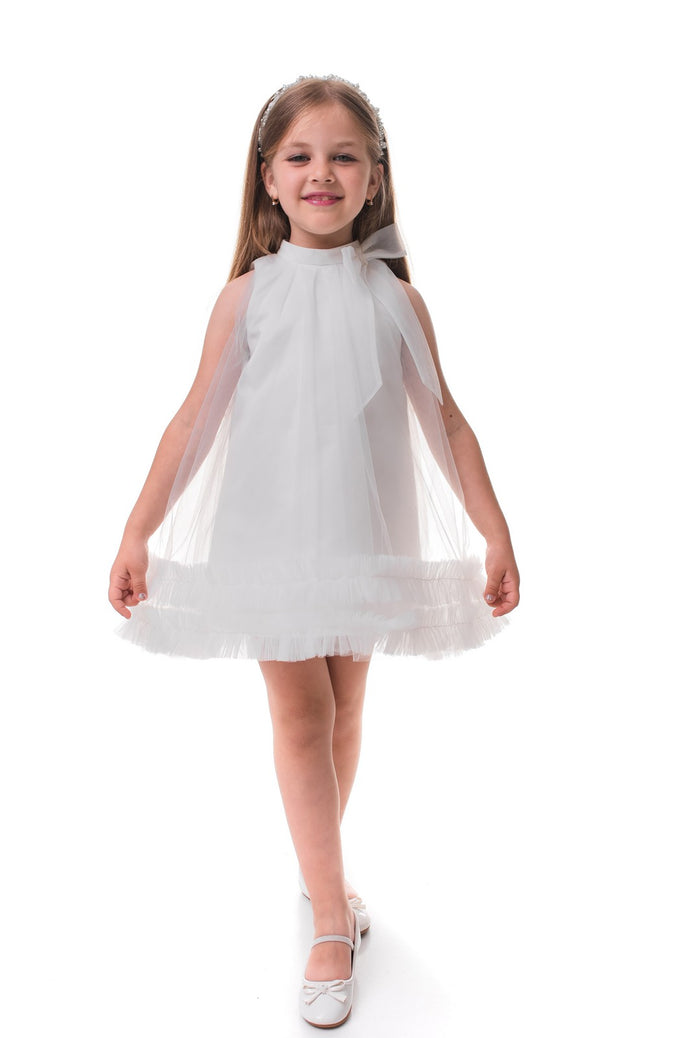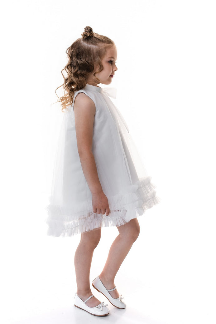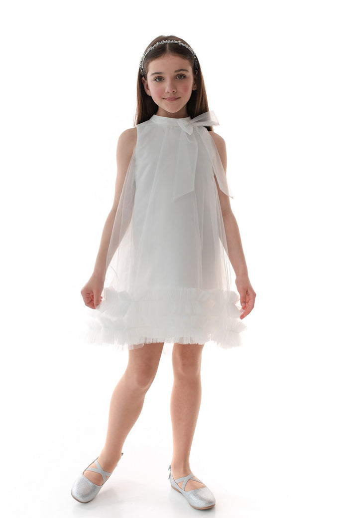 PORTIA - Rochie eleganta din voal si tulle fin cu funda decorativa la guler, alb
