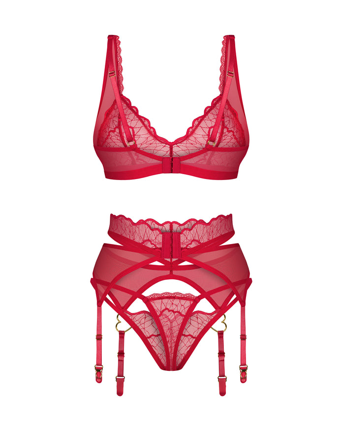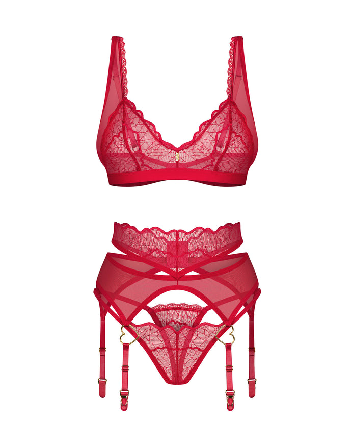 Set de lenjerie intimă Cupide Desir - compleu erotic cu sutien, chiloți și portjartier din dantelă fină, roșu