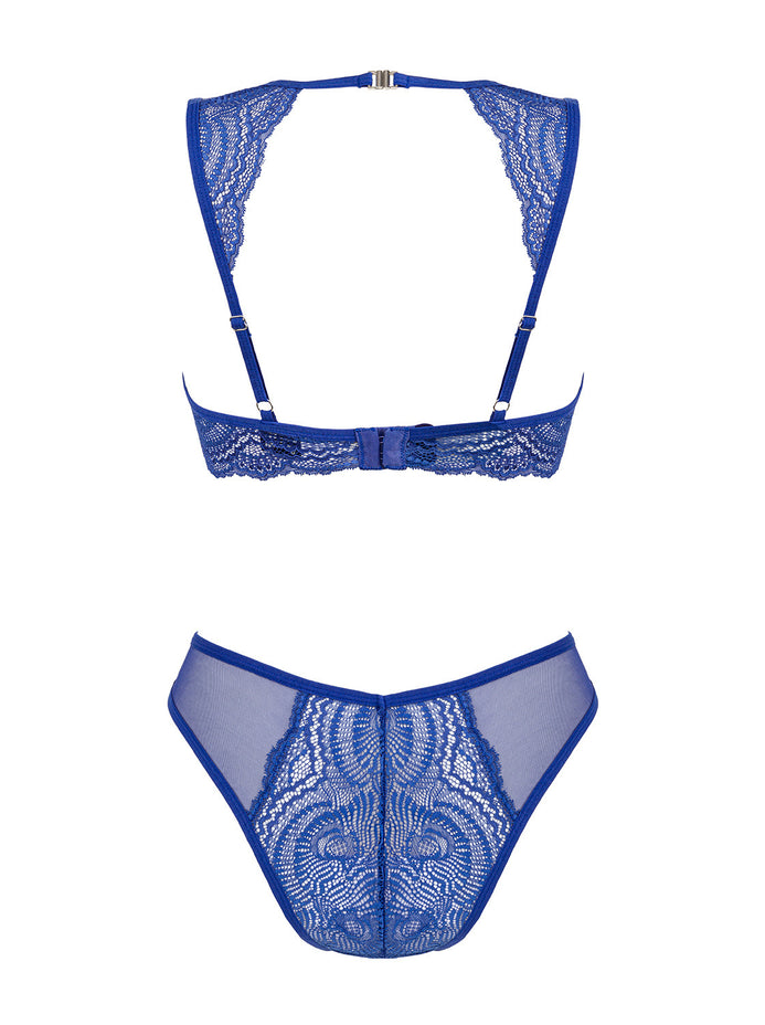 Un set din două piese realizat din materiale premium: tulle semitransparent şi dantelă senzuală în nuanta de albastru regal, creat pentru a-ți pune în valoare feminitatea și fanteziile.