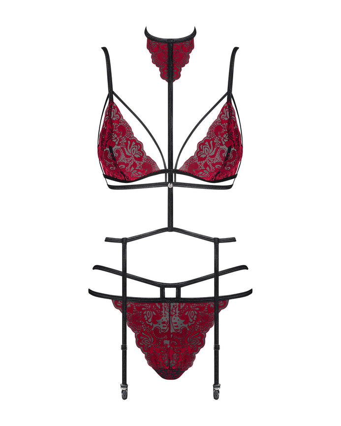 Set de lenjerie intimă Sugestina - compleu sexy cu sutien, chiloți, portjartier și colier de corp din dantelă cu catifea – L/XL