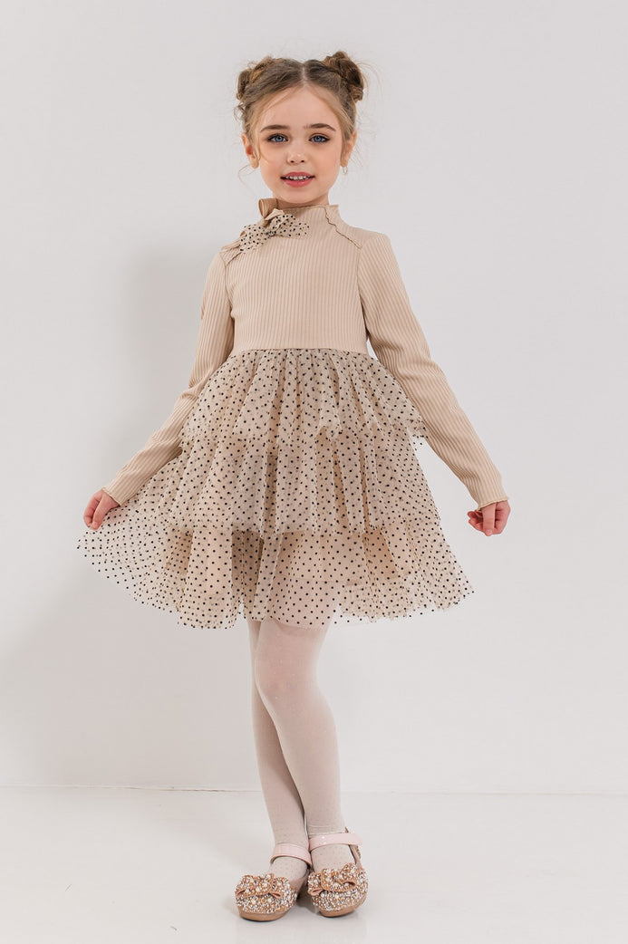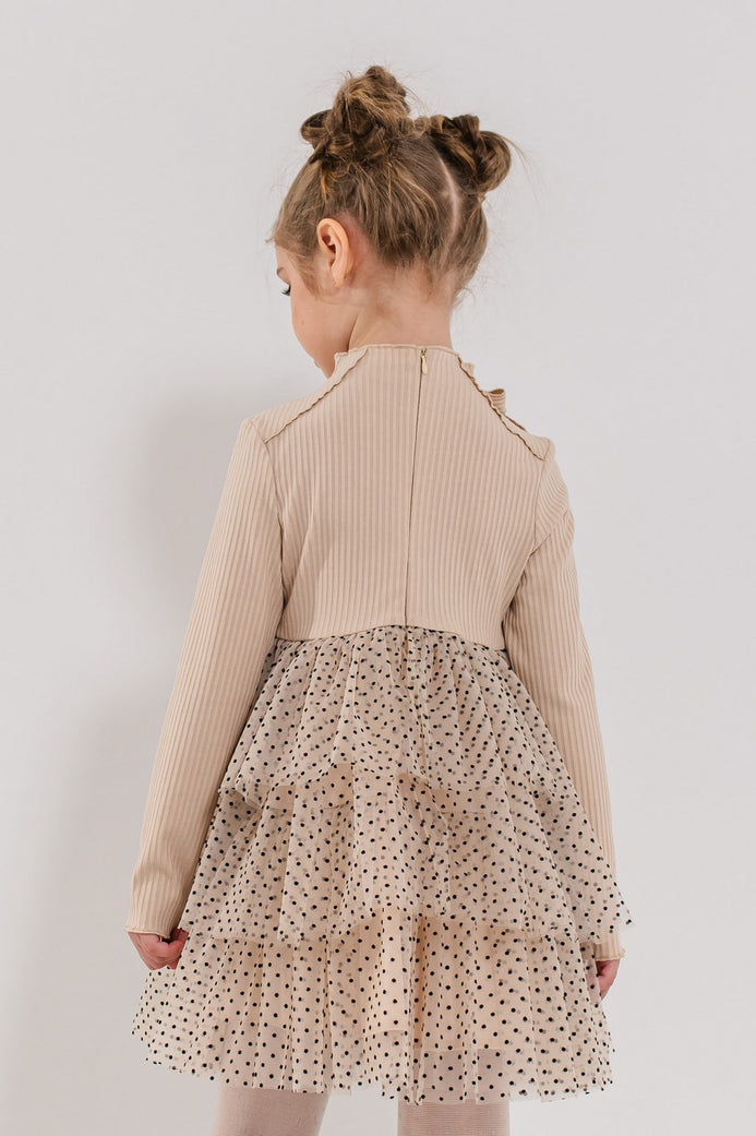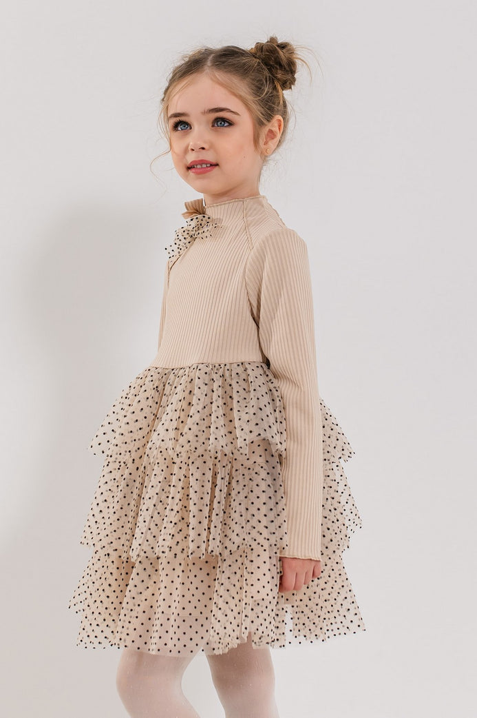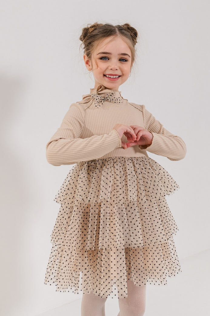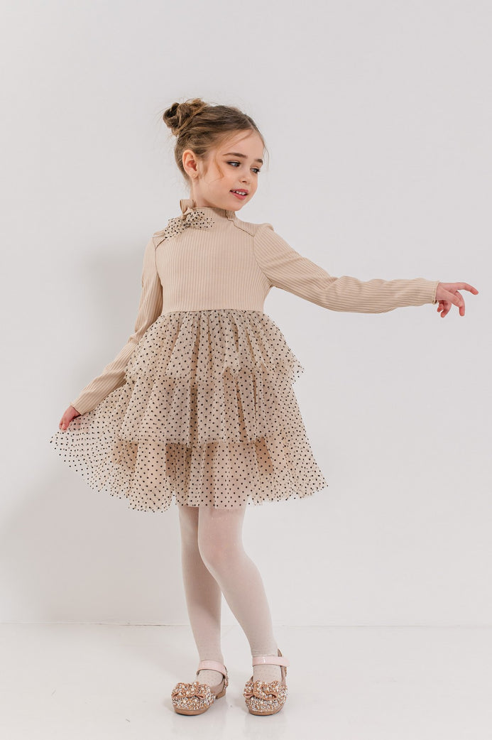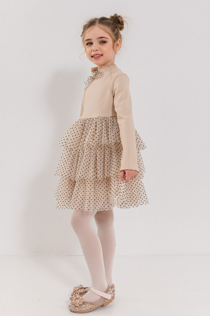 VARVARA - Rochita eleganta din bumbac si volane din tulle cu buline, bej
